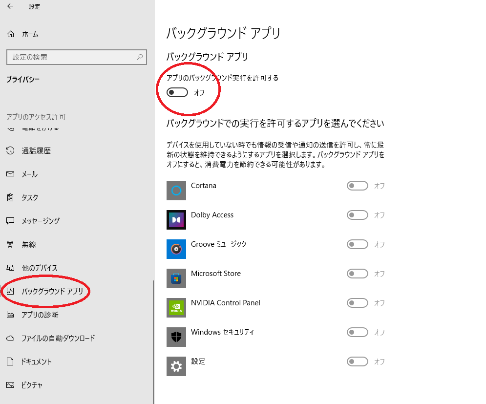 そこからバックグラウンドアプリ、の項目を左クリック
